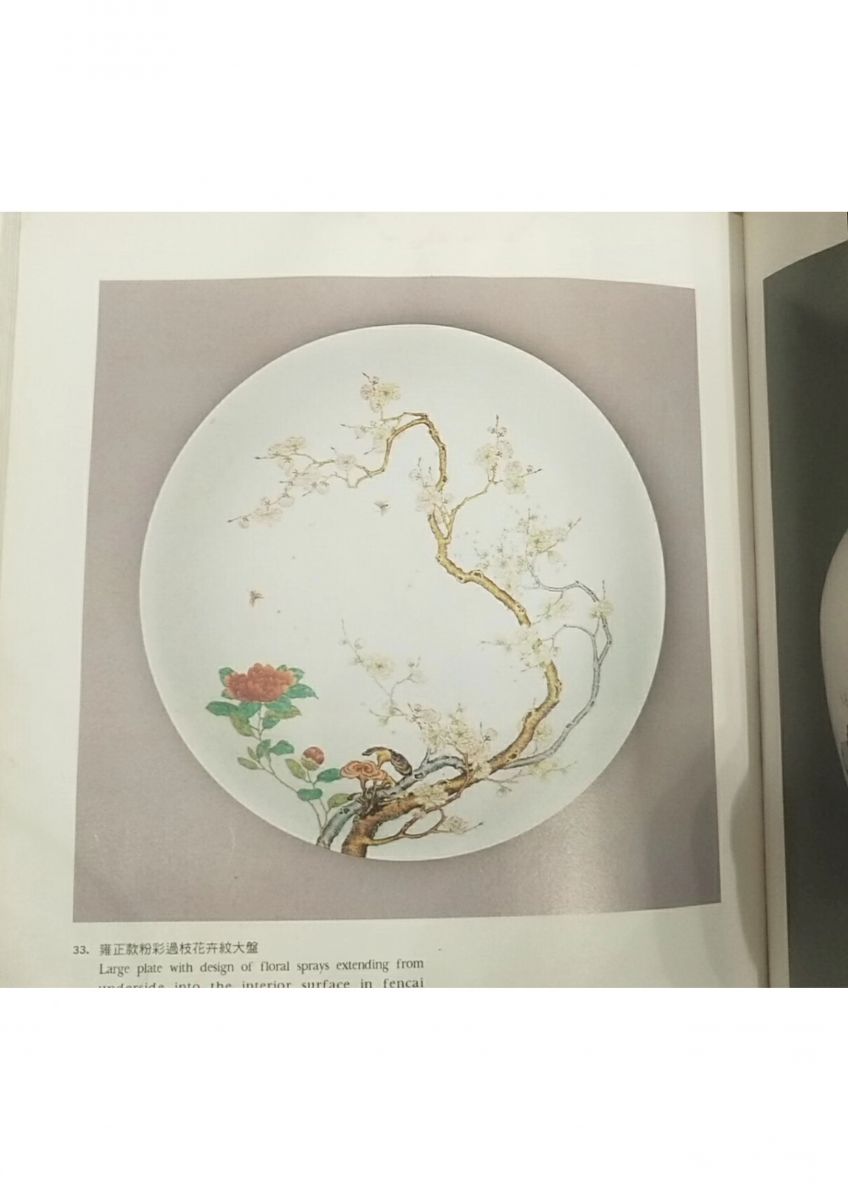 此盘侈口,浅腹,圈足。全器从外足绘梅树一株,枝干由盘壁经口沿至内壁及盘底。纹饰以淡粉、褐、杏黄、珊瑚红等色彩渲染。外底书青花双圈“大清雍正年制”六字双行楷书款,色调鲜丽柔和,充分表现出所绘纹饰浓淡不一和阴阳向背的质感。将折枝花卉从器表画至器里,枝杆相连,称为过枝,是雍正时期的一大特征。