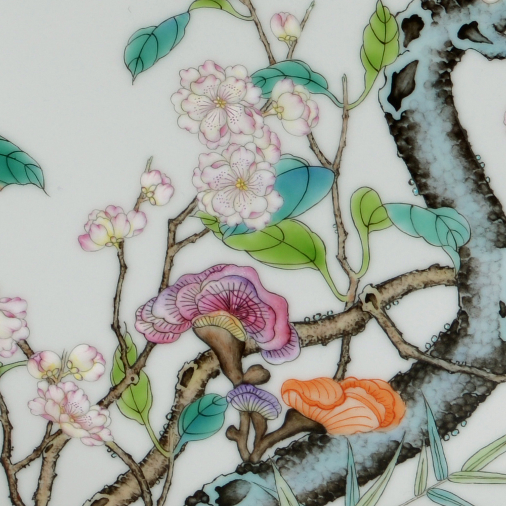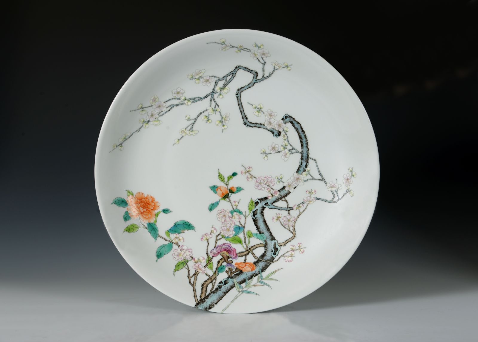 本藏品原件为清雍正朝官窑器,由“当代粉彩官窑”景德镇市传统粉彩瓷研究院成功复烧。此盘以粉彩绘梅枝,骨干精奇,枝上梅花盛开,一派雅意祥和之气,辅以吉瑞灵芝,更添得几分吉庆之兆。枝旁又绘茶花一丛,叶碧花绯,红翠相映,极具富贵之态。数枝花卉皆延伸至外壁,与盘内浑然一体,别具风韵。