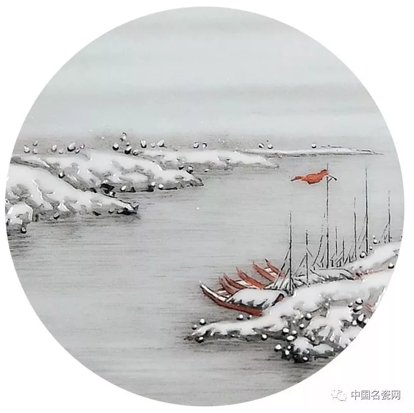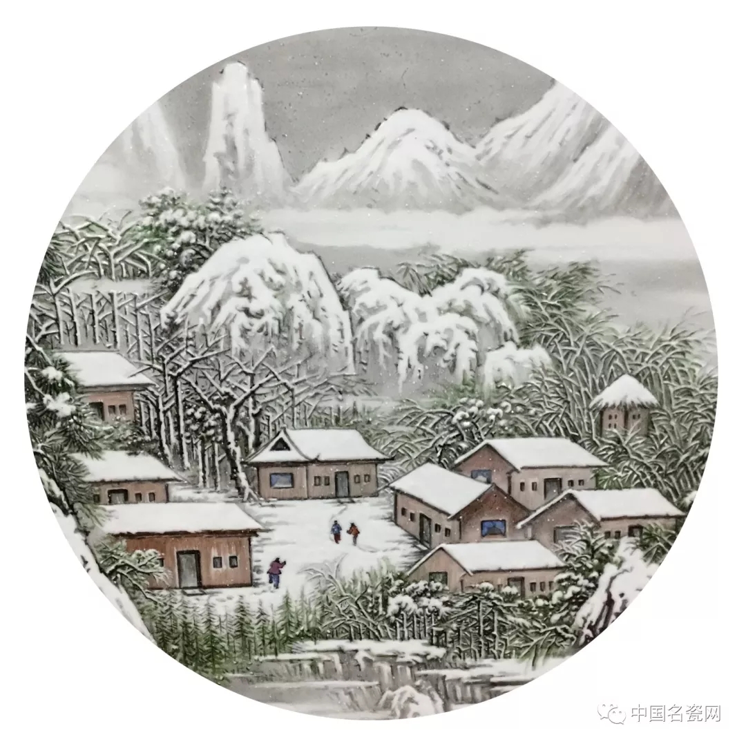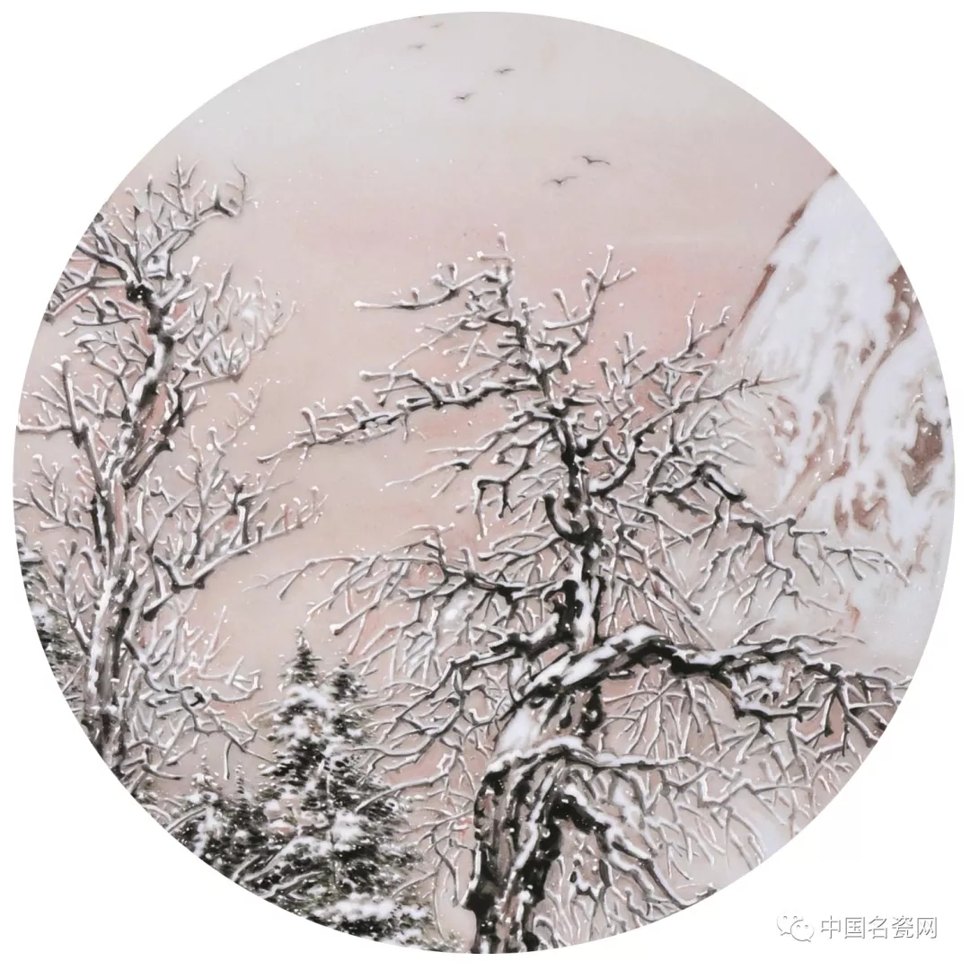 余刚的粉彩雪景工写兼备,深具中国画意蕴,玻璃白的运用营造了画面的立体效果,画面惜色而重在精妙,既有传统填色的粉润效果,又有文人画意的生动韵味。