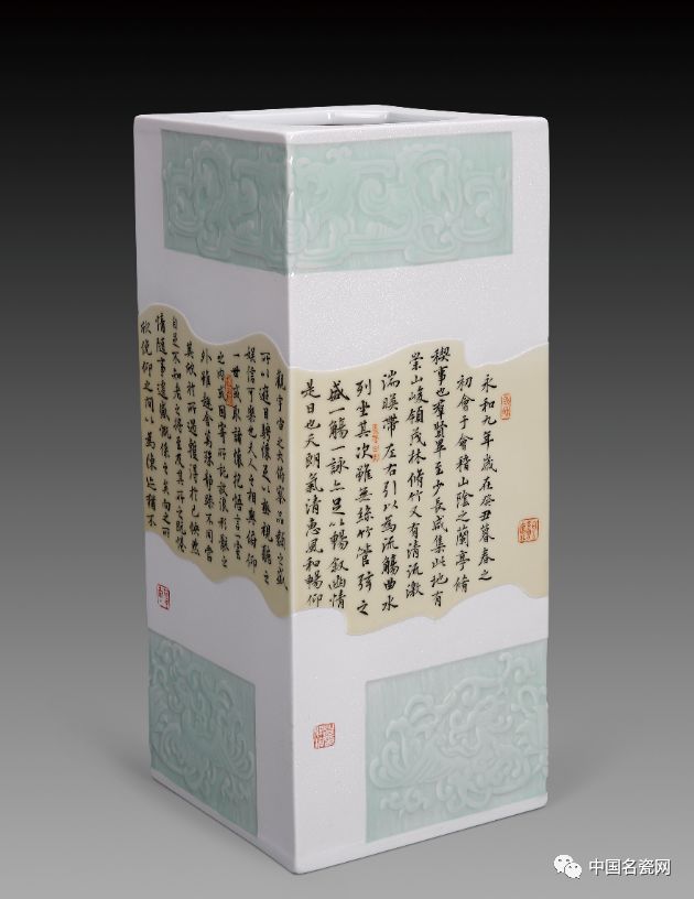 此作形制为镶器,作品主体以土黄色釉做出不规则的曲线块面,形如书法残卷,又让人联想到王羲之《兰亭序》文中的“曲水流觞”的意境。以典雅流美的行楷字体书写序文,以端庄秀雅的小楷落款,再以朱红色印章点缀,调节气氛。主体的上下部分以白色珍珠釉衬托,并雕刻青釉龙凤呈祥图纹作为点缀,造型简洁方正,稳重大方。