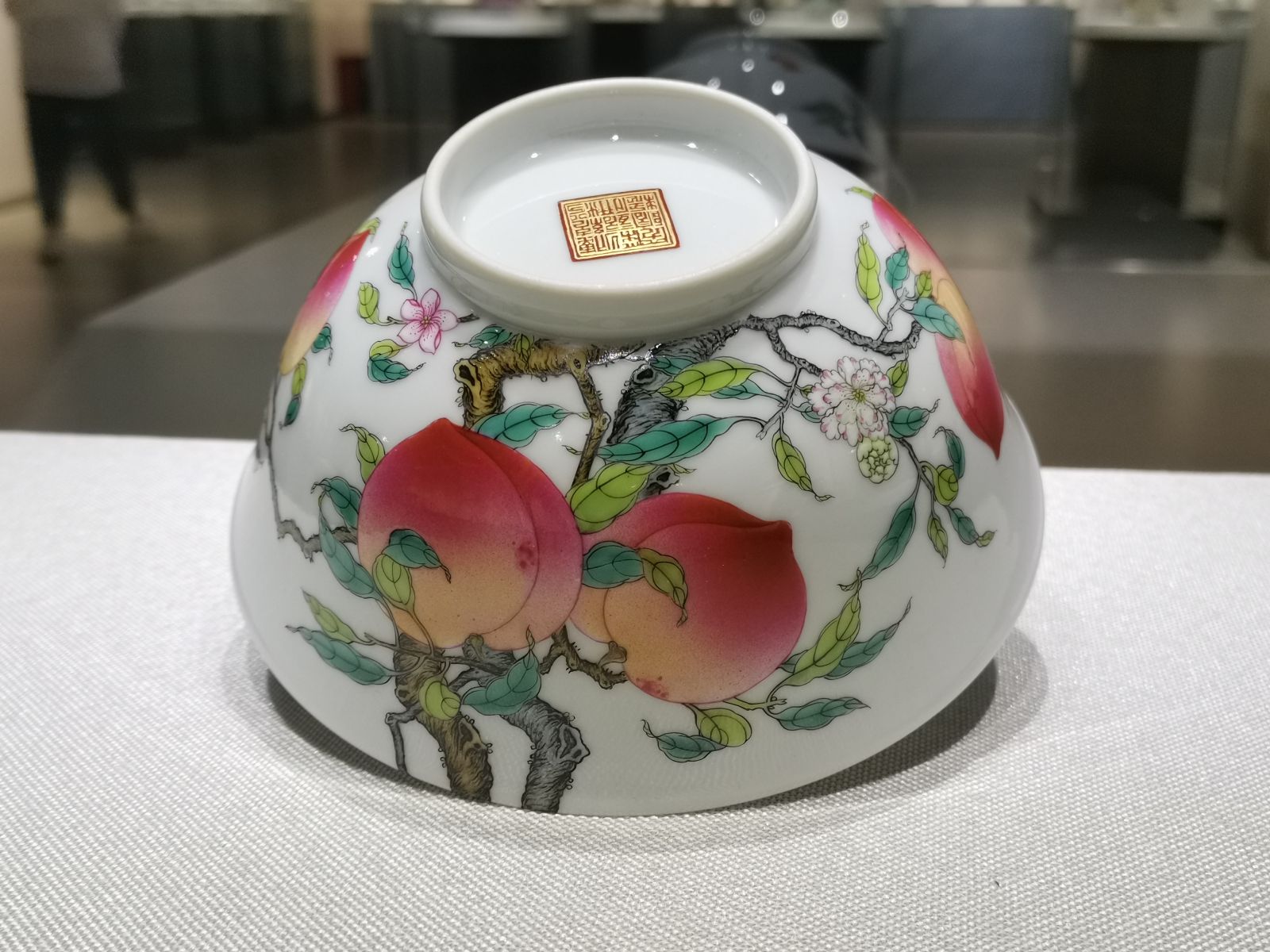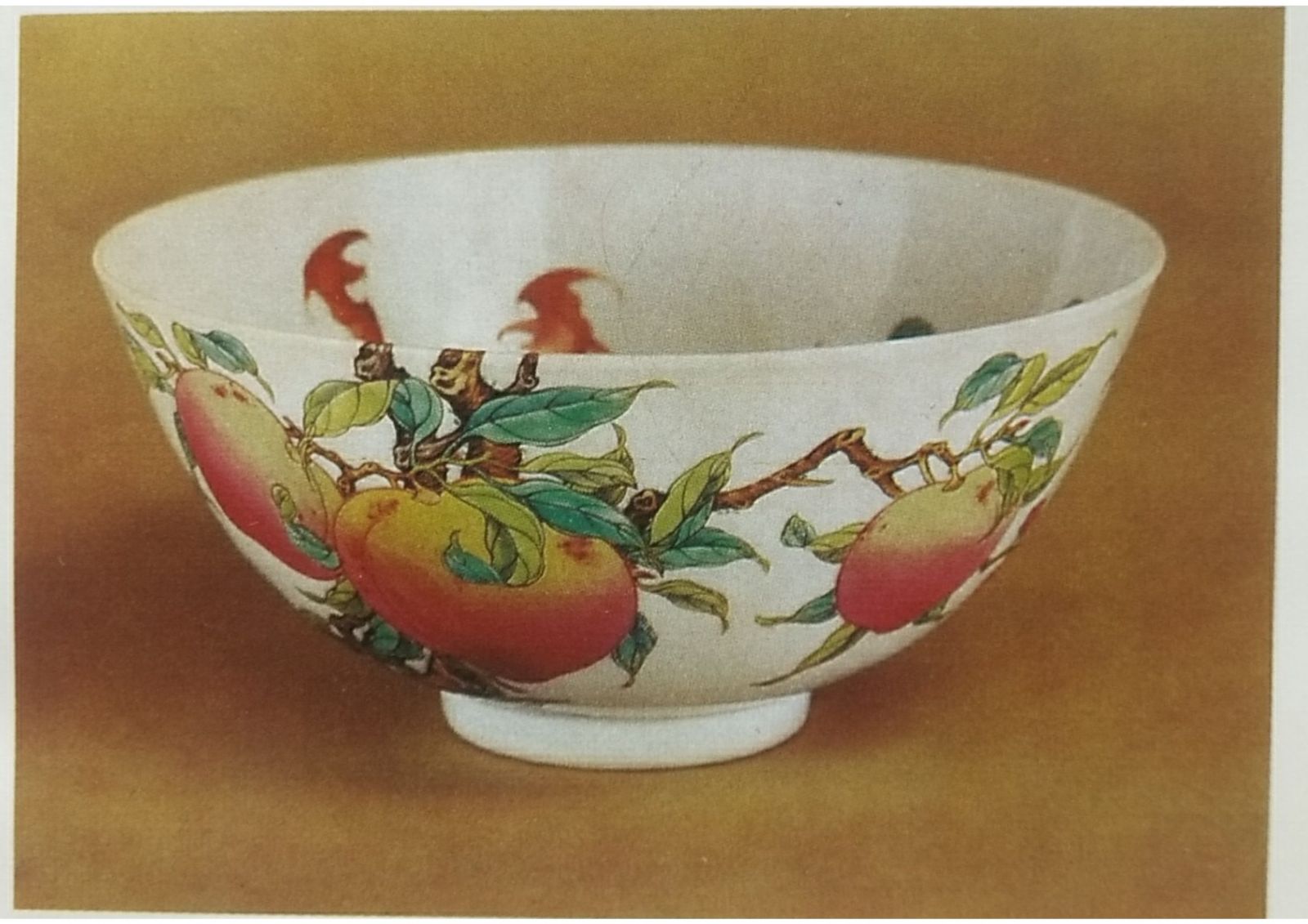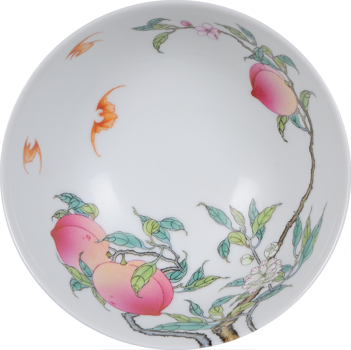 由“当代粉彩官窑”景德镇市传统粉彩瓷研究院成功复烧。碗外壁彩绘一株茂盛的桃树,桃树树干沿外壁一直延伸至碗内。桃树枝干上,错落有致地描绘有六只寿桃,树枝旁还有几只飞舞的红色蝙蝠,栩栩如生。寿桃和蝙蝠的寓意是“洪福齐天,福寿双全”。红色的寿桃和蝙蝠,粉色的桃花,嫩绿的枝叶,一起表达出吉祥喜庆之含义。
