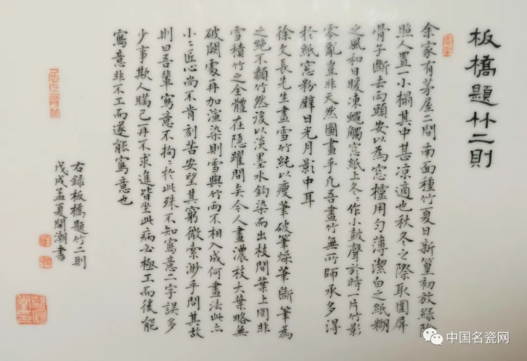 ....另一面则是汪开潮院士的瓷上书法《板桥题竹二则》。以下节选其二,全文为: