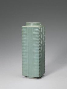 琮式瓶,方柱形,内有圆孔的玉器,是新石器时期的礼器,也称为玉琮。器型是圆口,短颈,方柱形长身,圈足、口、足大小相若,有的器身四面有凸起的横线装饰。其器内圆而外方,以象天圆地方之说。《周礼》记载:"以玉作六器,以礼天地四方。以苍璧礼天,以黄琮礼地,以青圭礼东方,以赤璋礼南方,以白琥礼西方,以玄璜礼北方。"瓷质琮式瓶沿袭了玉琮的基本形制,只是玉器之内圆,上下通透,而瓷制者加了圈足和底,演化为一种瓶。