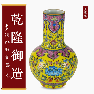 黄地粉彩锦上添花纸槌瓶 景德镇手工手绘高...