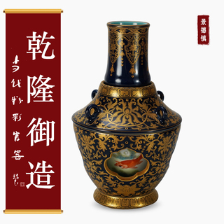 霁青地描金鱼游春水瓶 景德镇手工手绘高端...