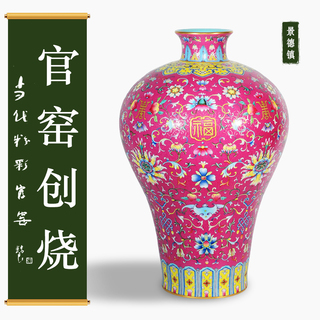 粉彩轧道胭脂红地凤螭纹撇口瓶 景德镇重工...