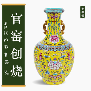 粉彩轧道黄地花卉如意纹葫芦瓶 景德镇重...