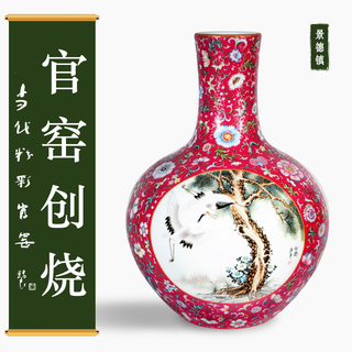 粉彩轧道胭脂红地开光《松鹤延年》天球瓶...