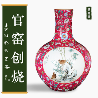 粉彩轧道胭脂红地开光《竹报平安》天球瓶...