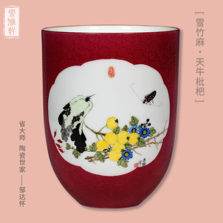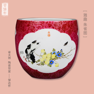 邹达怀《雅趣 竹雀图》胭脂红轧道缸 陶...