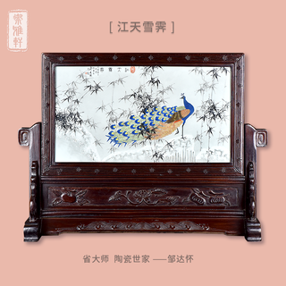邹达怀《江天雪霁》酸枝缠枝莲插屏 陶瓷...