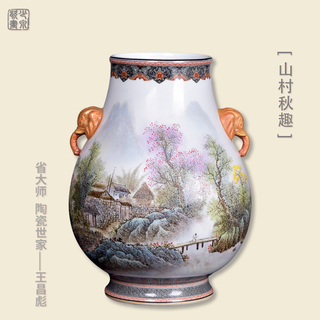 王昌彪《山村秋趣》重工边角象耳尊 景德镇陶...