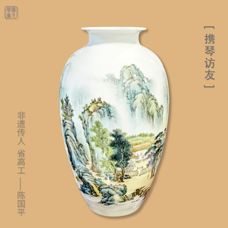 陈国平粉彩《携琴访友》罗汉瓶 景德镇陶瓷...